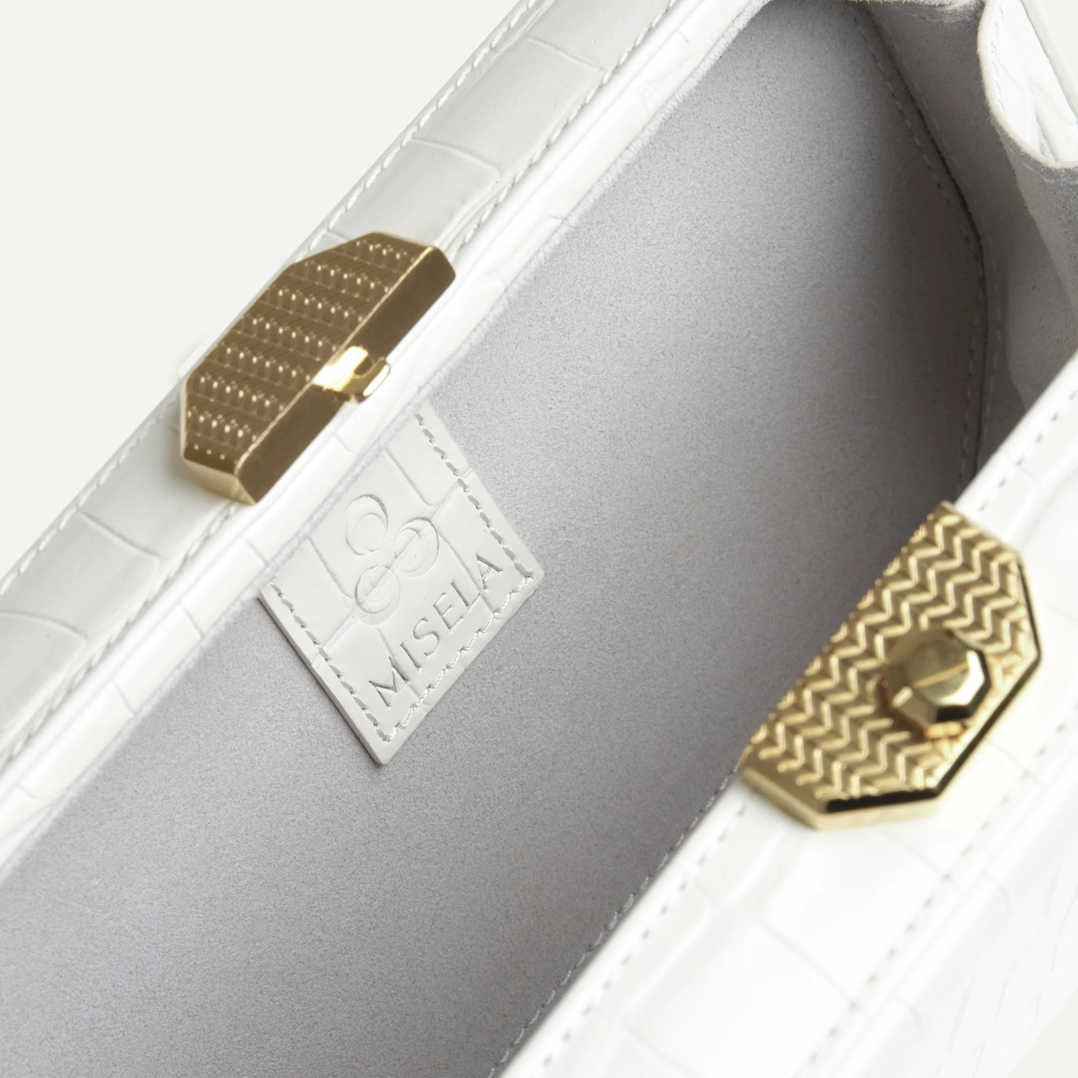 A standout piece from Misela’s Belgravia collection, the Alexa is a sophisticated octagon-shaped clutch designed for special occasions. Crafted in crocodile-pattern embossed leather for SS’25 and featuring Misela’s iconic herringbone lock, the Alexa clutch adds rich texture and refined elegance to any ensemble