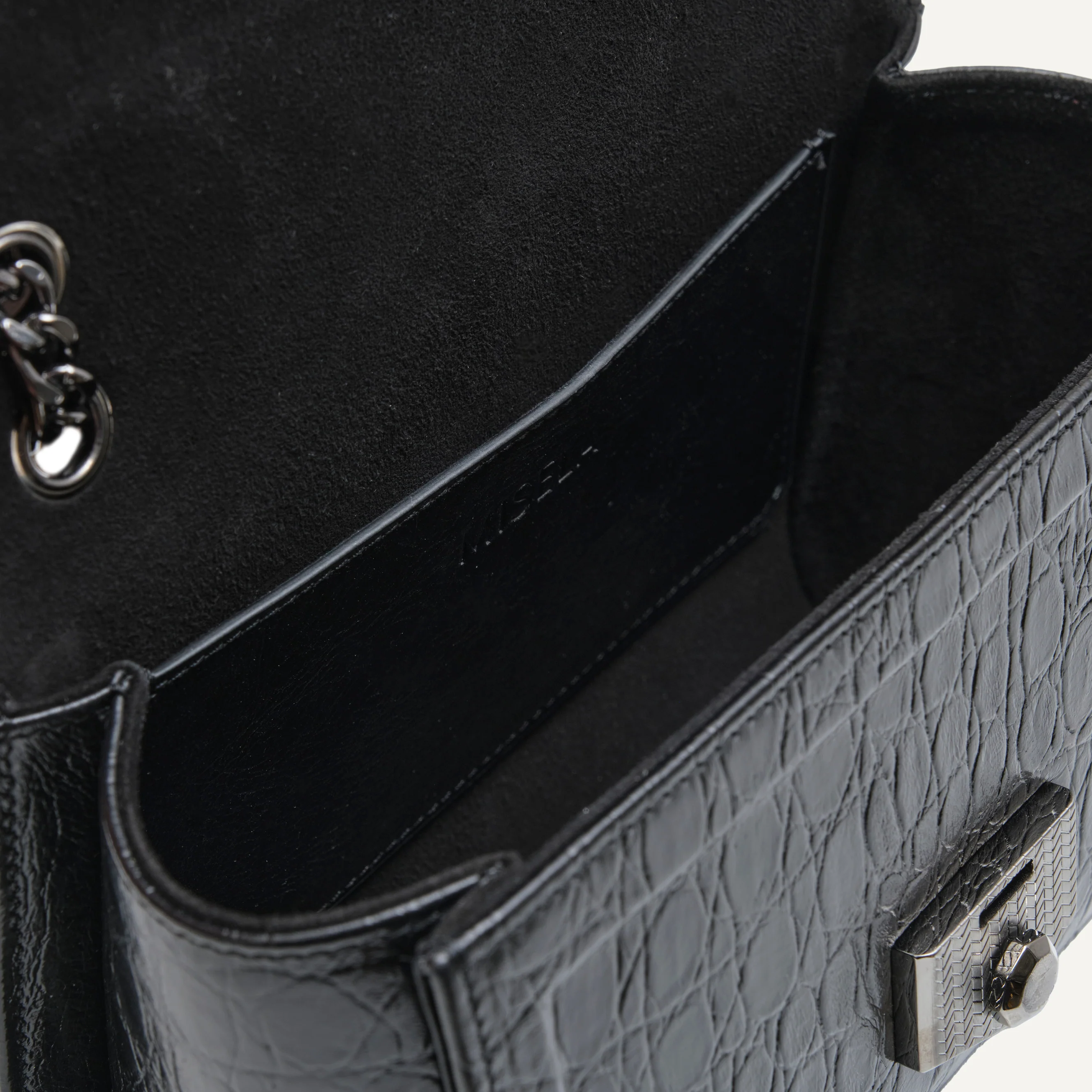 This version is a chain strap shoulder bag, closed with the iconic herringbone lock closure. The herringbone pattern is a signature detail in Misela’s designs, featured across several of our collections.